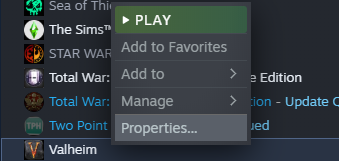 Step Nine: Now you can return to your Steam library. Right-click on Valheim again, but instead of clicking on “Manage” you’re going to select “Properties.”