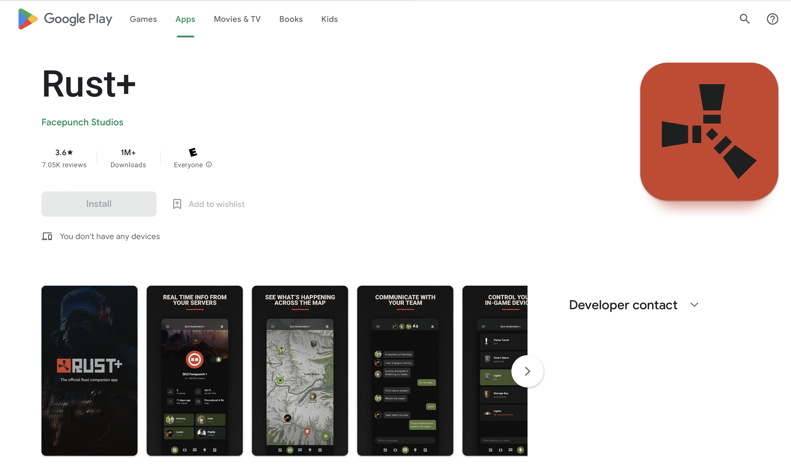 Rust+ is the official companion app for the game Rust. Developed by Facepunch Studios, the creators of Rust, this app is a game-changer for Rust players.