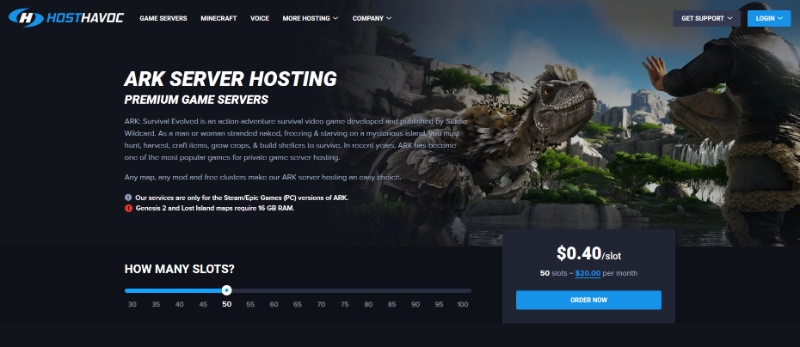 Host Havoc offers a minimum of 30 player slots at $0.50 per slot ($15/month), whilst the maximum number of slots (100) costs $0.30 per slot ($30/month). There are optional additional fees for: