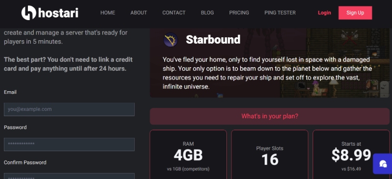 Hostari's Starbound server starts at $8.99 per month and includes a 24-hour free trial. The plan provides 4 GB of RAM and 16 player slots. You can begin your free trial without linking a payment method, meaning there's no risk involved.
