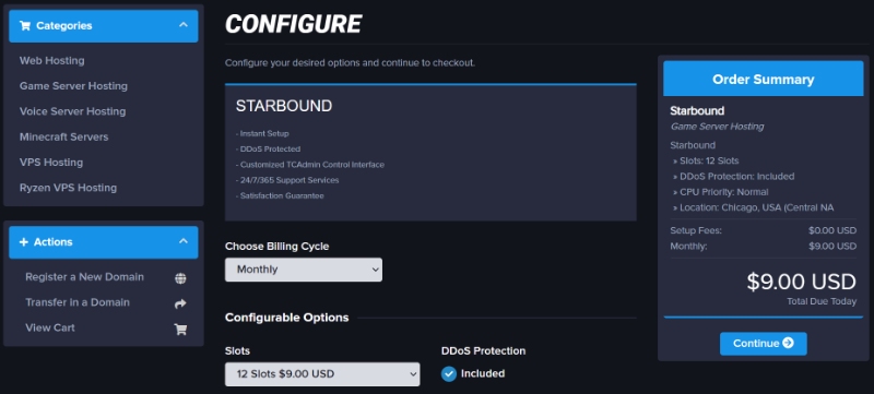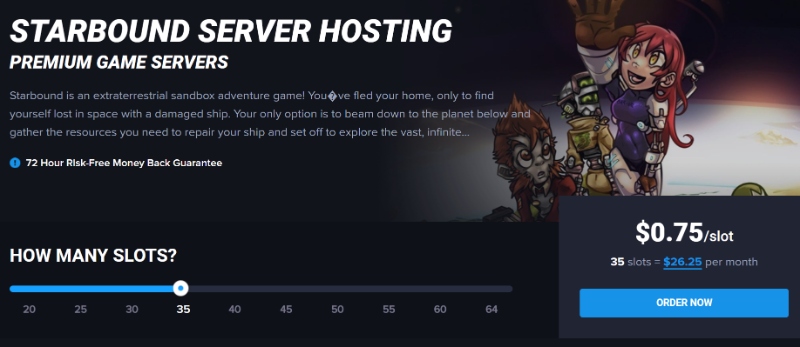 Host Havoc offers Starbound servers starting at $9.00 for 12-player slots ($0.75 per slot). You can choose to have up to 50 player slots and select from four payment frequencies:
