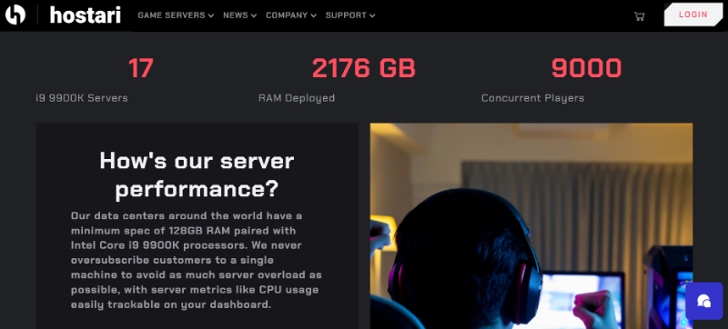 Hostari houses 17 Intel Core i9 9900K servers, each equipped with a minimum of 128 GB RAM. With data centers located worldwide, they avoid overloading servers to prevent technical issues. To address any concerns, users can track their server metrics on their dashboard or test their connection using the ping tester.