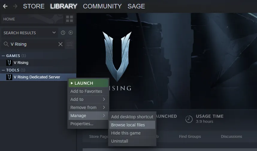 - In your Steam library, search for ‘V Rising Dedicated Server’.