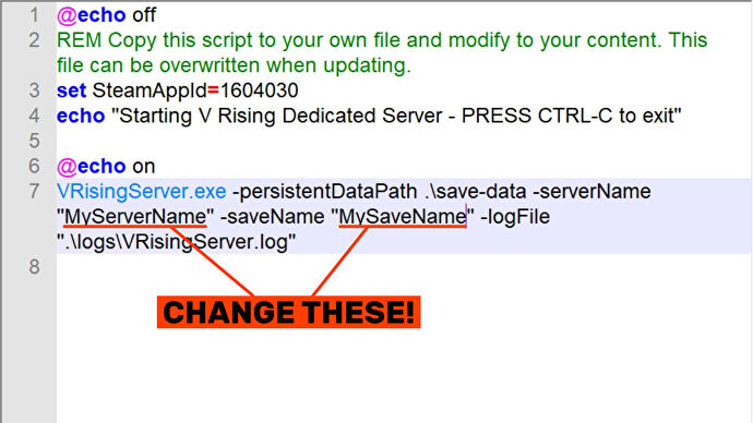 2. At the bottom, you will need to replace ‘MyServerName’ and ‘MySaveName’ with your preference. This can be changed to anything you like, within reason. The server name you choose will be displayed to players before entering, with the same name being shown when saving your game.