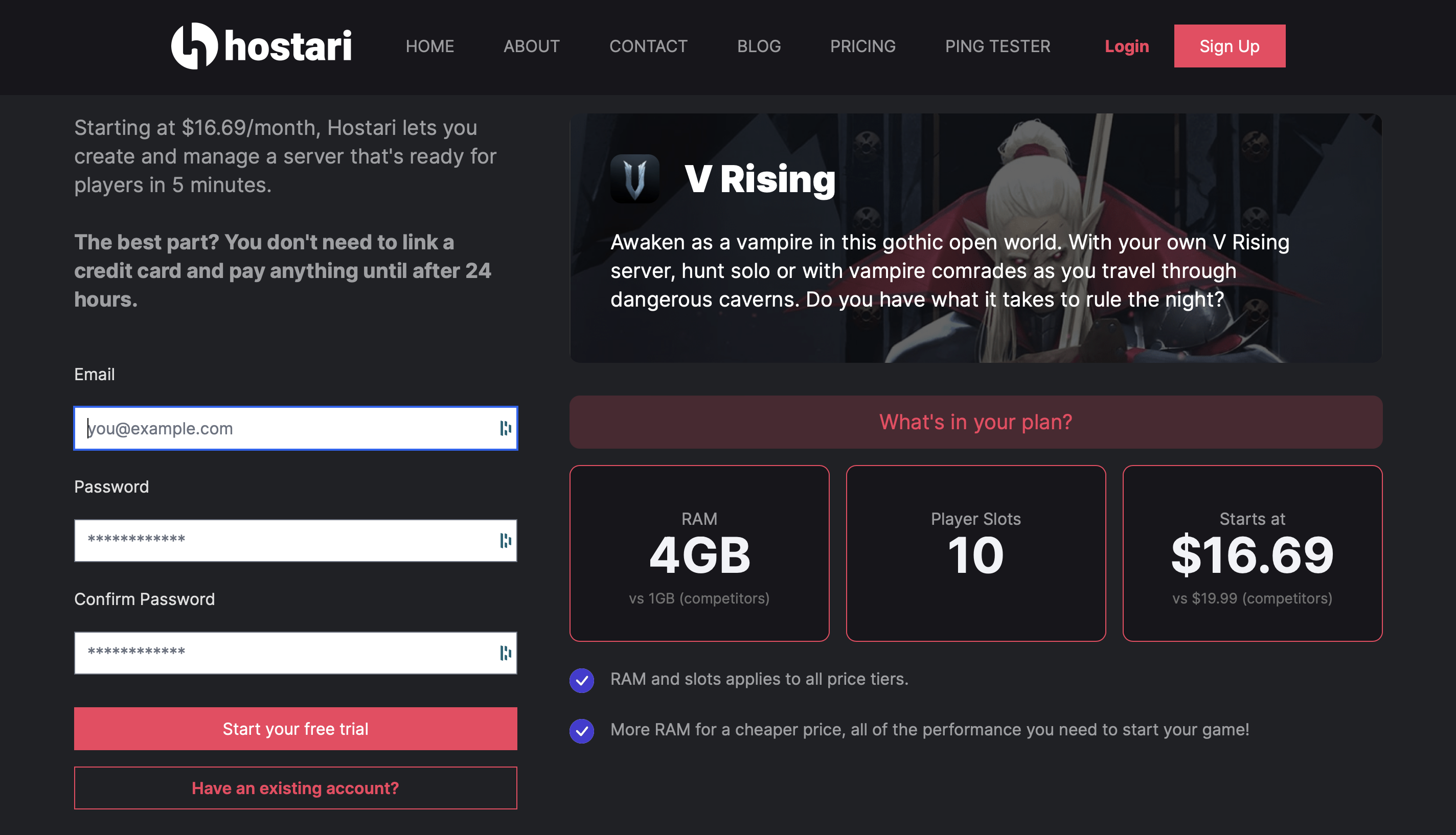 If you want to avoid the stress of creating a server for yourself, Hostari has got you covered. We offer the best plans to give you an optimal gaming experience. Our high-speed dedicated servers offer a superb level of connectivity, regardless of where you are in the world. Sign up today to receive a 24-hour free trial, no credit card needed!