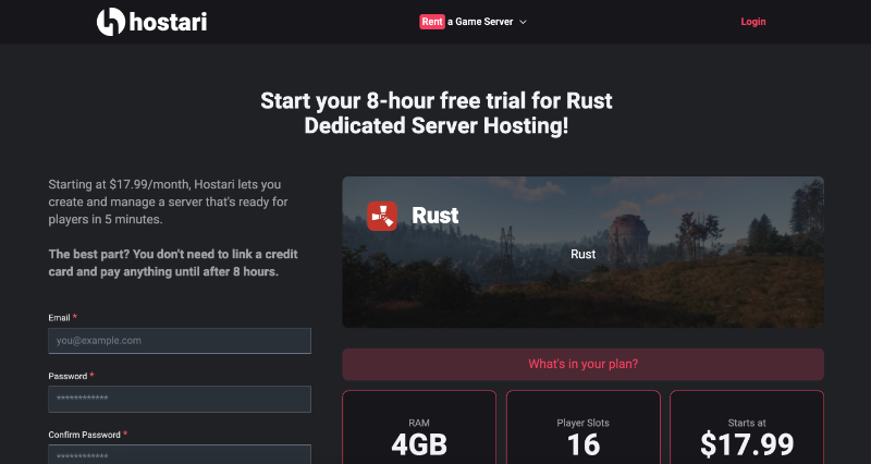 Once on the Hostari website, locate the "Rent A Game Server" section at the top middle of the page. Hover your mouse over this area and click on "Rust" to choose it as your game server.