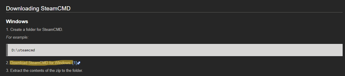 - Enter the term Steamcmd into Google and click on the link: https://developer.valvesoftware.com/wiki/SteamCMD