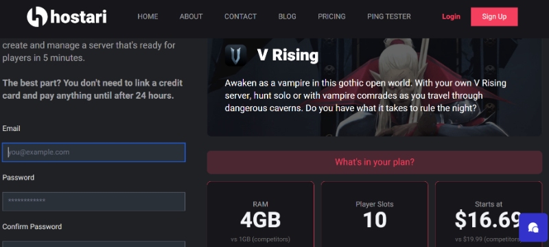 Hostari’s V Rising server has a starting price of $16.69 for 10-player slots and 4 GB RAM. We also offer a 24-hour free trial — no credit card required!