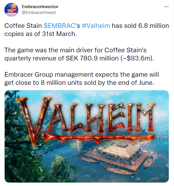Valheim’s publisher, Coffee Stain Publishing, has reported that their Norse-inspired title was the driving force behind a quarterly revenue of almost 94 million USD.