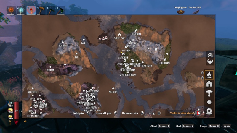 The map in Valheim has other features you might not know about. For instance, you could add customizable pins to it and keep an eye on where other players are located. To add a marker, simply select an icon from the right side of the map and then double-click anywhere on it. This will create a customizable pin/marker for future reference.
