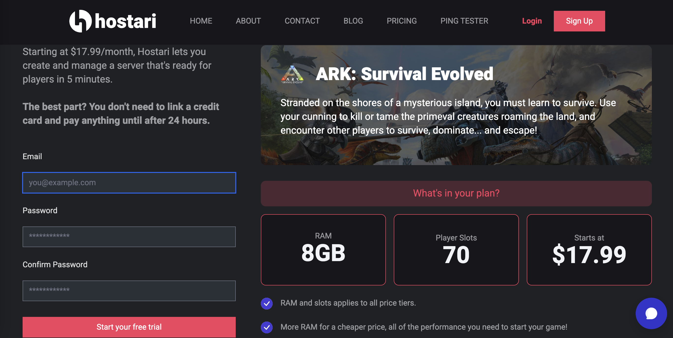 STEP 1: Sign up for a 24-hour FREE trial Hostari ARK dedicated server.