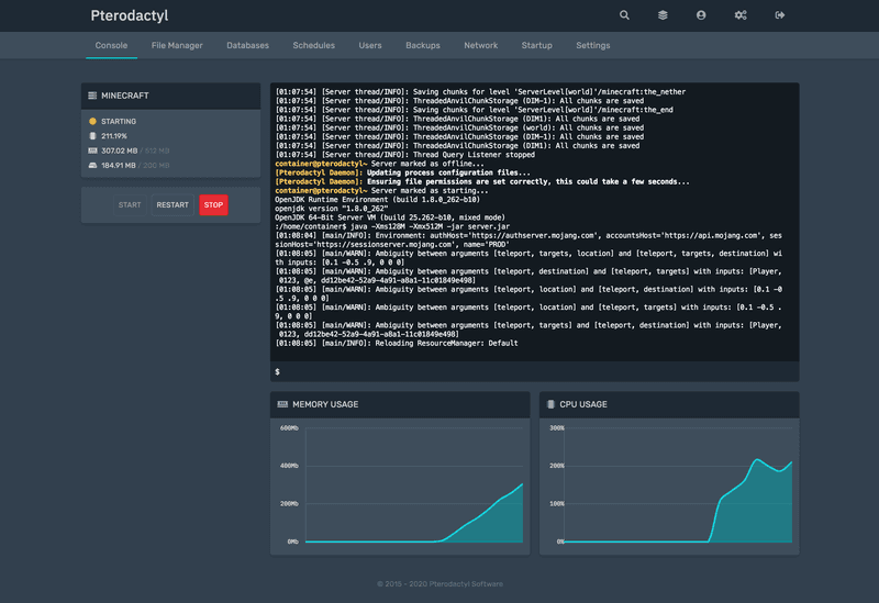 With Pterodactyl, you can easily start, stop, and restart your server, as well as monitor its performance and resource usage. You can also manage server files, install plugins and mods, and configure game settings, all from a single, easy-to-use interface.