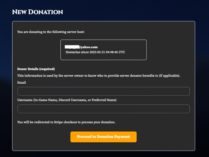 When your donator clicks on the link, they will be directed to a form where they can enter their email and username. They can then choose to proceed to the Stripe checkout page where they can adjust the amount (minimum $1.00) and fill out their card details. After the payment is successful, they should receive a confirmation page with all the transaction details. You will also receive a confirmation that someone has donated to your server.